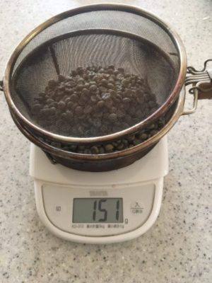 生豆を150gはかります。写真の豆はキリマンジャロです。